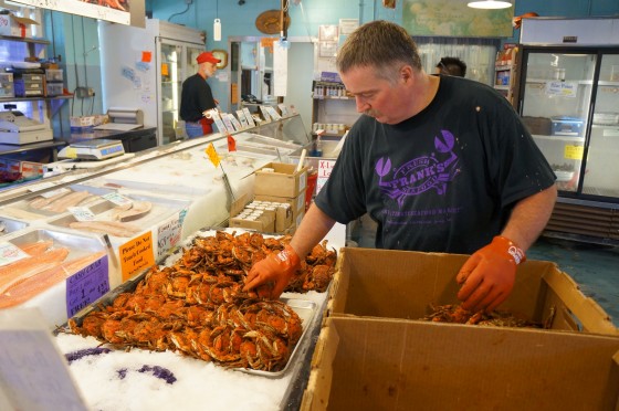 「Frank’s Seafood/ フランクズシーフード」 は魚市場の入り口にあります。1946年創業の家族経営のこのお店、歴史は1920年にさかのぼります。ボルチモアに住むある母が、子育てしながらオイスターを売っていましたが、8人の子供を育てるためにクラブケーキも作って売り始め、それを大きくなった子供たちが25セントで訪問販売を始めたことからはじまったそうです。その子供のひとりがフランク。お店のオーナーです。店内にはカニの他、たくさんのお魚が売られています。私たちが店内にいたときも地元の人がパーティー用にたくさんのお魚を注文して帰って行きました。家の近所にここ欲しいです。カリフォルニアまで運べないのが残念!