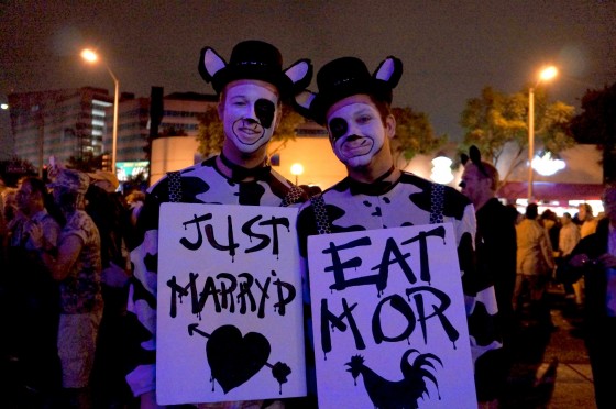毎年恒例、ゲイの聖地ウェストハリウッドで行われる世界最大級のハロウィンコスチュームパレードが今年も盛大に行われました〜!世界中から50万人もの人が訪れるというこのパレード、クレイジーでエキセントリックな人ばかり。写真上はHootersの衣装を身にまとったおやじと、本物のHootersガール!美しさは歴然ですが、ポーズも表情もなりきるところはさすが。ゲイの皆様の気合いの入れっぷりに圧倒されまくりのパレードでございます。