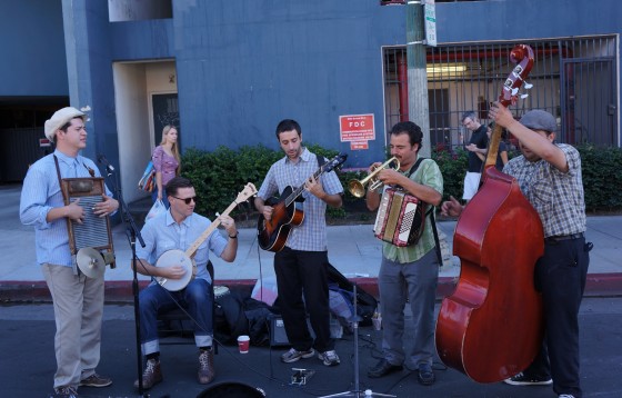 朝市ではきちんと演奏許可証を手に入れたバンドマンやアーティスト達も参加できるようになっています。この5人組はジャズ。トランペットの音色が日曜日の朝の雲ひとつない空に優しく包み込まれるようでした。オーガニックファーマーズマーケットはロサンゼルス中で週末を中心に毎日開催しています。