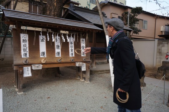 この神社、かなり遊べる神社。まずは、開運輪投げ!心願成就、金運、健康運、仕事学業運、恋愛運のなかから、叶ってほしいものめがけて輪を投げます。一緒にいた映画ライターの友人にむりやりやらせてみました。3つ投げられます。