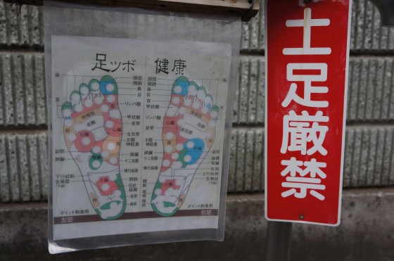 Oh, by the way, when you try Ashi tsubo stone, don’t forget to take off your shoes. Red sign says “Don’t put your shoes on!” This is Japanese decent culture.