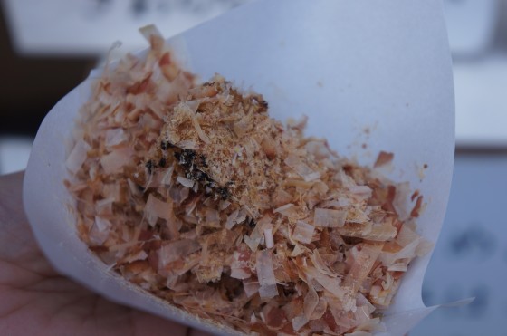 一個200円の高級焼きおにぎりですが、その場で焼いた上に、鰹節かいわし節を選んでかけてもらうのが特徴。そこに書いてありますのは、「鰹節屋の6代目が考案いたしました。炭火で香ばしく焼いてから鰹節と昆布で出汁をとった当店秘伝のだし醤油を塗り、ねこちゃんが大好きな鰹節をたっぷりとかけて召し上がっていただく、、、。そこでつけた名前がねこまんま焼おにぎりでございます」鰹節は4番カビまでつけた本枯節の風味を、片口いわしの頭とはらわたを取り除いたイワシの削りはくせになるそうです。