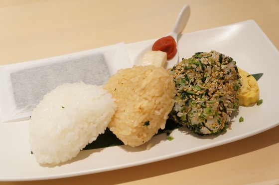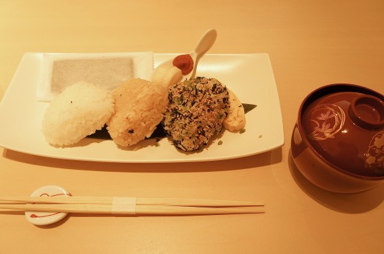 塩むすび、五目、山菜とごまの3つのむすびに、海苔、玉子焼き、梅干し、お新香がついてました。五ツ星お米マイスター金子真人氏が厳選してくださった、むすび米。鎌倉時代から伝わる佐賀県の棚田で穫れる、貴重なお米だそうです。塩むすびが気に入りました。友と頼んで、あっという間に完食。