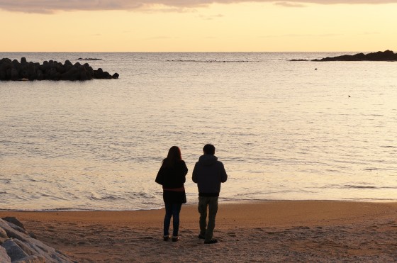 人かげまばらな冬のあづり浜。夕日をただぼーっとしみじみと眺めようと来てみたのですが、近所にお住まいのカメラが趣味のおじさんに遭遇。「ここは、角度によって、まるであそこに浮かんでる島が夕日を食べているように見える瞬間があるんだよ」との地元のとっておきのネタを教えてくださいました。それから、そのおじさんと共にベスポジ探しスタート。