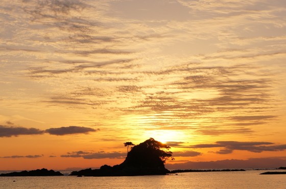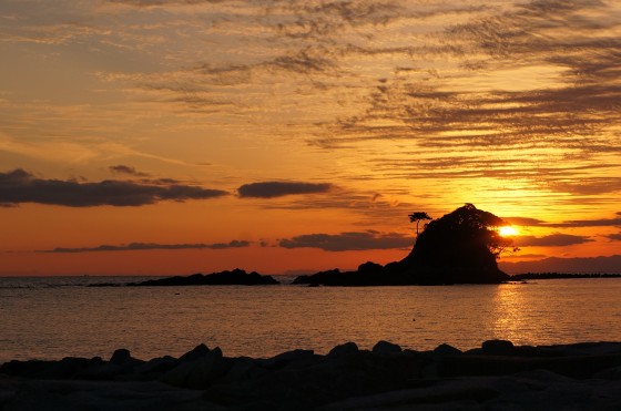 志摩の夕日をどうしても見たくって、島の最先端までドライブしてみました。近くの展望台からは、きれいに夕日と海のパノラマが見えるらしいのですが、どうしても海岸に行きたくて、あづり浜へ。ここ、地元の人には評判の隠れ絶景夕日スポットだそうです。海の真ん中に浮かぶ小島に夕日が落ちる時、まるで怪獣がオレンジの夕日を食べているかのような瞬間が!