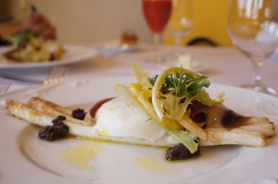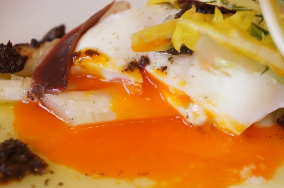 ホワイトアスパラガスのローストを、黒オリーブとアンチョビベースのタプナードソースで。ローストの上に乗っているのは、ポーチドエッグです。こちらのプレートは+1000円のスペシャル前菜。