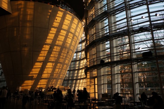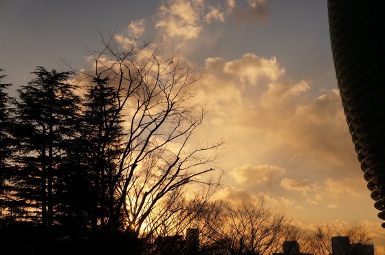 夕焼けに染まった国立新美術館の壁!コンクリートの壁は光や色を自在に受けるから、時間によって顔ががらっと変化しますね。一日いたら、変化を楽しめそう。