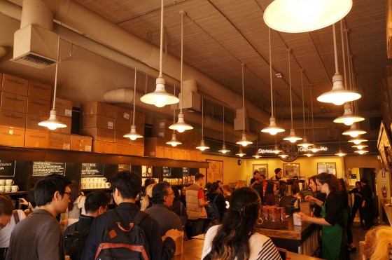凄い人の数!!!外に溢れるほど列が続いています。エスプレッソ系ドリンクと普通のコーヒーや限定グッズなどをオーダーする場所に分かれていて、コーヒーのほうは4つくらいレジがあります。世界でここだけしか買えないグッズを手に入れる人が多いようです。