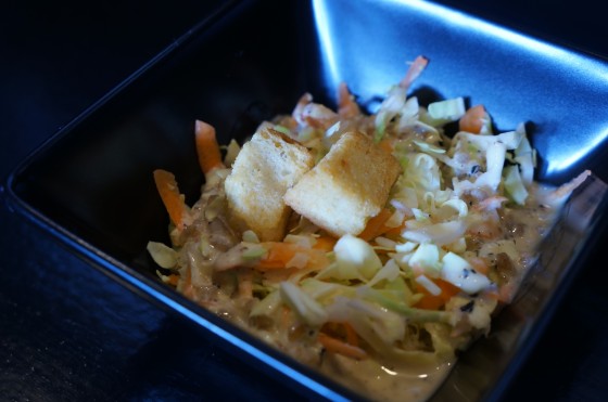 サラダは、キャベツ、ニンジン、クルトンを胡麻味の甘めのソースで混ぜたコールスロースタイル。バーガーとポテトとドリンクだけで満足だけど、バーガーを待ってる間にこれが出てくるとお得感があります。なんか嬉しい。