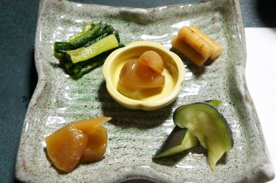 まずは、前菜の盛り合わせ? こちらもお漬け物です。里ゴボウの鰹味、水茄子、うり、野沢菜、らっきょう。季節によってもちろん内容は変化します。お漬け物好きにはたまらない旨味です★