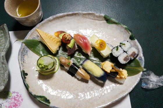 漬け物が酢飯にこんなに合うなんて!!!プレートの中身は、たけのこの醤油煮、奈良漬の上にアボカド&トマト&豆腐味噌、みょうが甘酢漬、セロリ&トマト&胡麻味噌、ズッキーニ巻の上にアボカド&タマネギ、エリンギ、わさびなす、卵焼にゴボウ、ゴボウと梅じそ巻。8貫に4つ巻物がつきます。